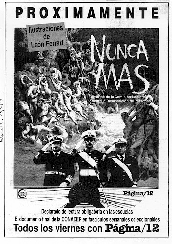 Paradójicamente, o no, el artista, escultor y dibujante argentino denuncia el rol de los medios de comunicación publicando los collages en una de las series de fascículos sobre el informe que la CONADEP elaboró en 1984 y que el diario Página/12 y la editorial EUDEBA publicaron en 1996.