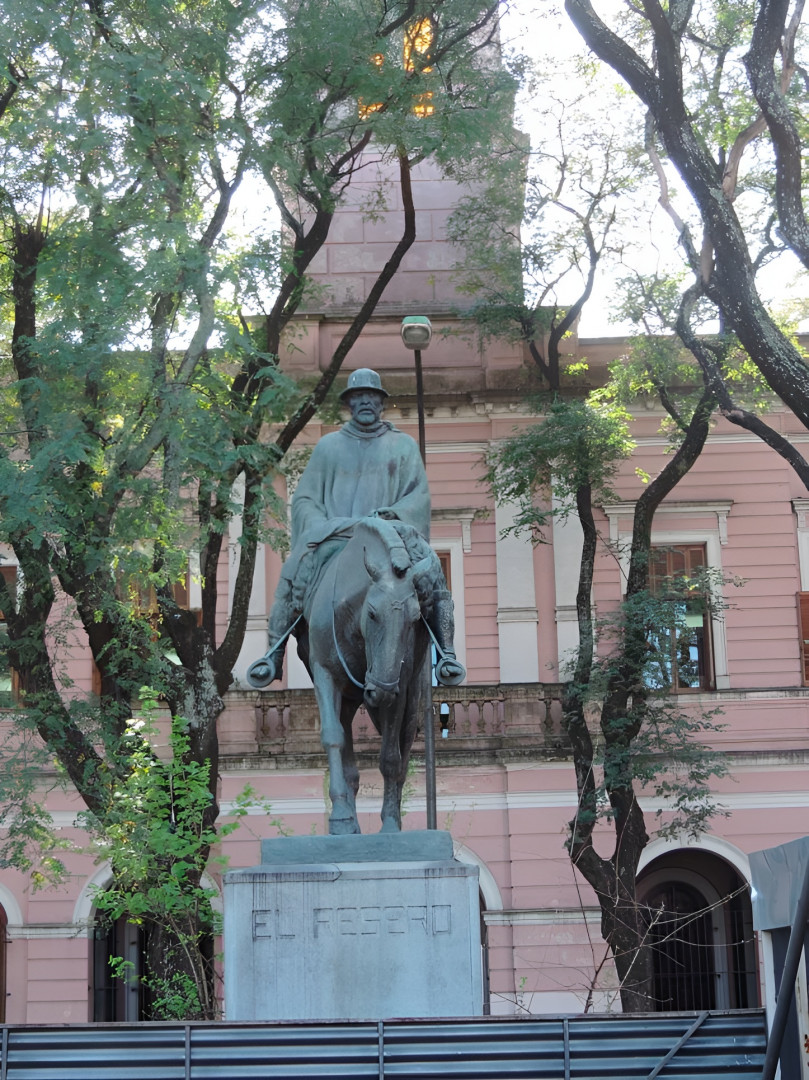 Descripción: es una figura ecuestre de bronce. El modelo que usó el artista para su obra fue un caballo pasuco cuya característica es que al caminar hace que el jinete viaje más descansado. Montado por un resero con vestimenta típica. Es una obra artística con rasgos auténticamente argentinos. El personaje tan representativo de lo nuestro dio materia para producciones literarias y escultóricas. Esta obra inmortaliza a su creador.