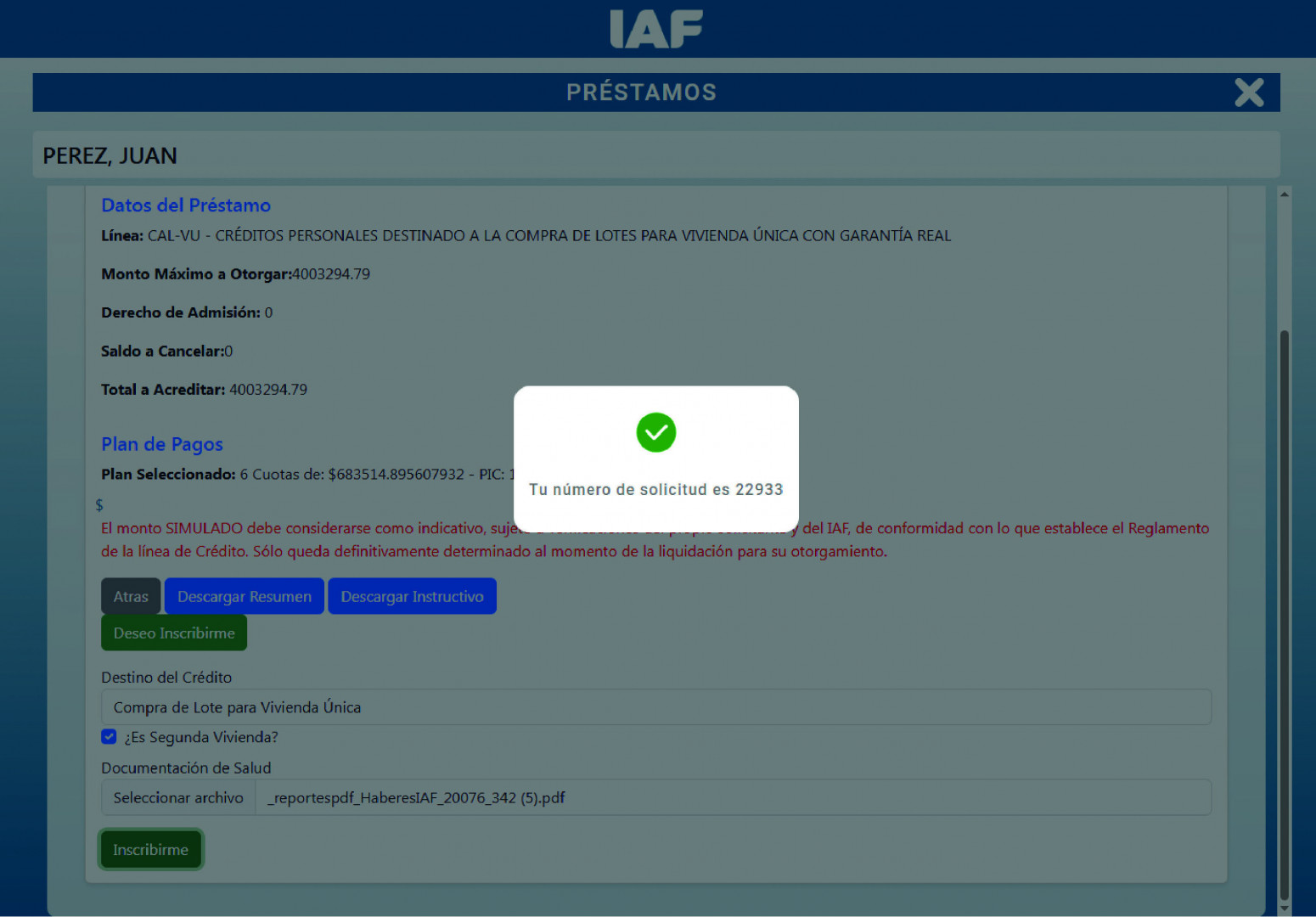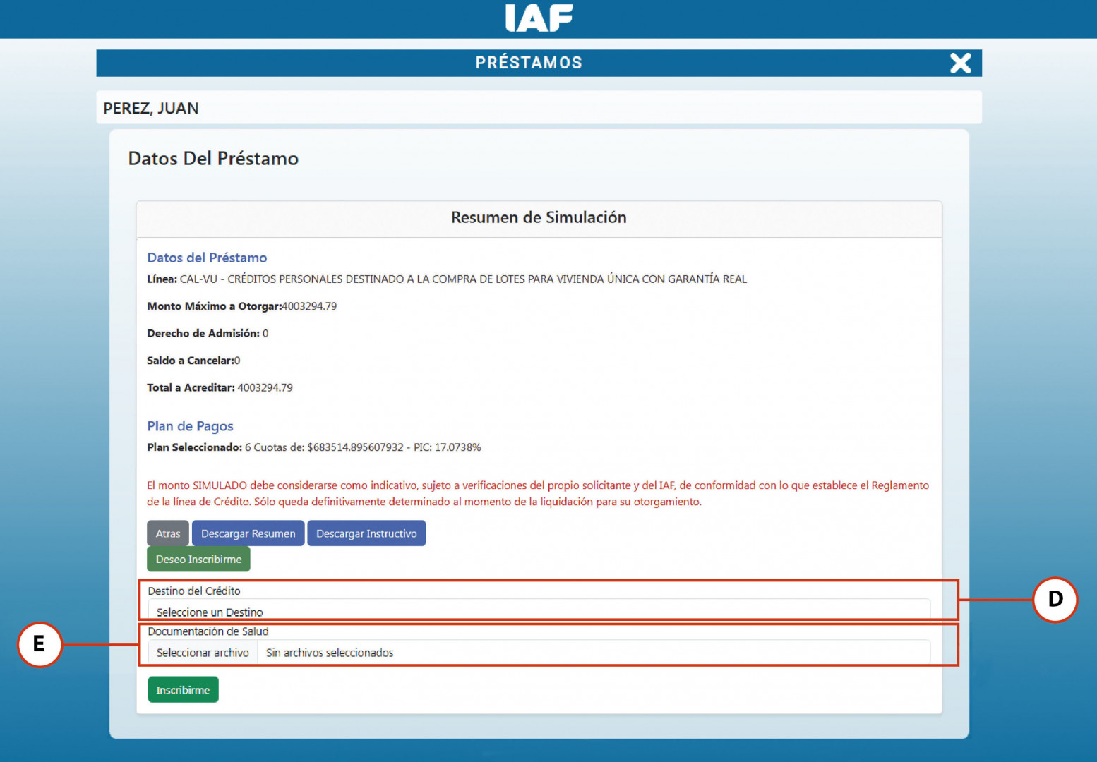 9) Tenés que elegir el Destino del Crédito (D), adjuntar la Documentación de Salud (E) y presionar Inscribirme.