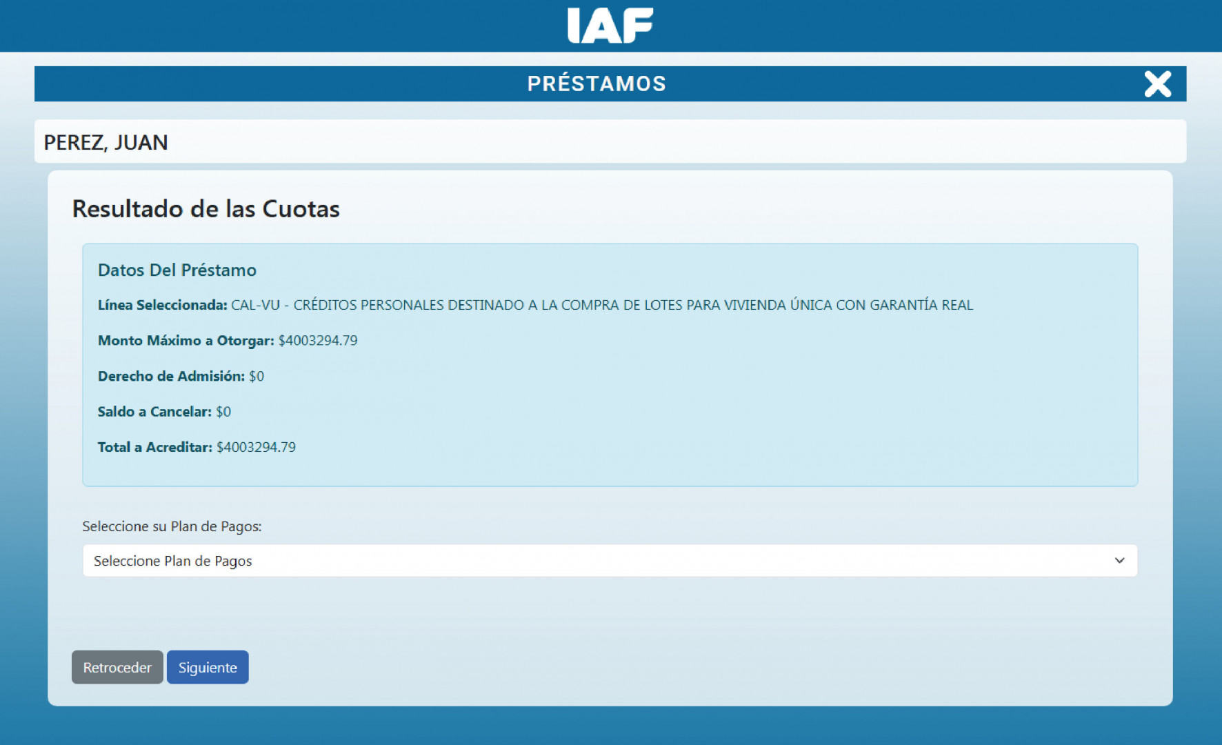 7) Seleccioná el Plan de Pagos del desplegable y presioná Siguiente.