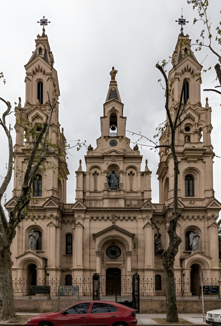La fachada polícroma, decorada con multiplicidad de nichos, mascarones y esculturas de materiales diversos, está encuadrada por esbeltas torres exentas de cuatro cuerpos adosadas al campanario central del frente, lo que le otorga un marco monumental a una iglesia que, en realidad, es de una sola nave. El tambor sobre el crucero está rodeado por pináculos y un círculo de ángeles que son el leitmotiv del templo. En su colorido interior, decorado como un salón con grandes arañas venecianas, se conservan dos grupos escultóricos: el de Martín de Álzaga fue esculpido por L. Cortoli, mientras que el de Felicitas y su hijo Félix pertenece a Antonio Pasaglia. “El Salvador del Mundo” y los doce apóstoles son obras del escultor alemán Thor Waldeern; el resto de la esculturas pertenecen a Juan Belloti. Fue restaurada recientemente por el Plan de Recuperación de fachadas de la Dirección de Regeneración Urbana del GCBA.