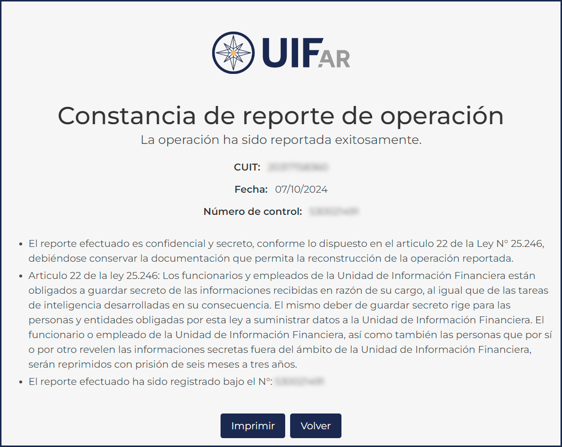 Una vez reportada la operación, el sistema emitirá la Constancia de Reporte de Operación que indica la CUIT del reportante, la fecha del reporte y el número de control.