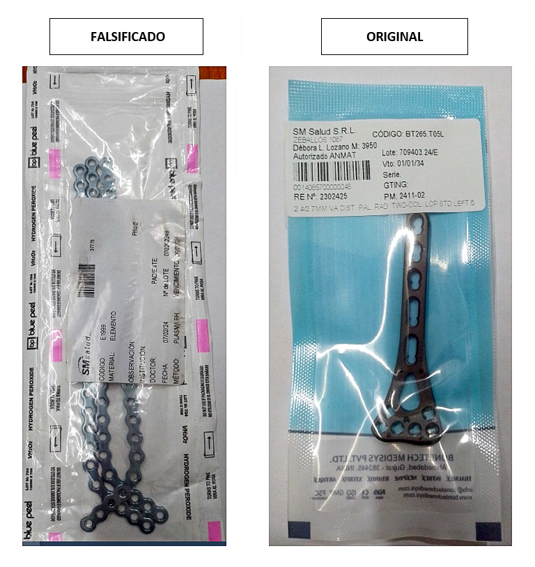 La empresa SM Salud SRL detenta la titularidad ante ANMAT del registro PM 2411-2, que corresponde a «Sistemas de Placas y Tornillos», marca Bonetech Medisys, categorizado dentro de la clase de riesgo III. Sin embargo, la responsable técnica de la firma SM Salud SRL, informó que el CODIGO E1999 declarado en la unidad bajo estudio es un código inexistente y que por sus características no es una unidad comercializada por la firma titular, sino que se trata de un producto FALSIFICADO.