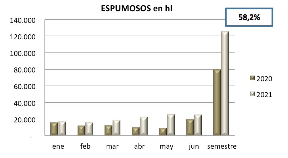 Asimismo, crecen los vinos varietales y los tintos, los cuales impulsan el consumo de la categoría 18,3% mientras que los espumosos se recuperan muy fuerte de un 2020 que fue adverso con crecimientos importantes del orden del 58% para el semestre.