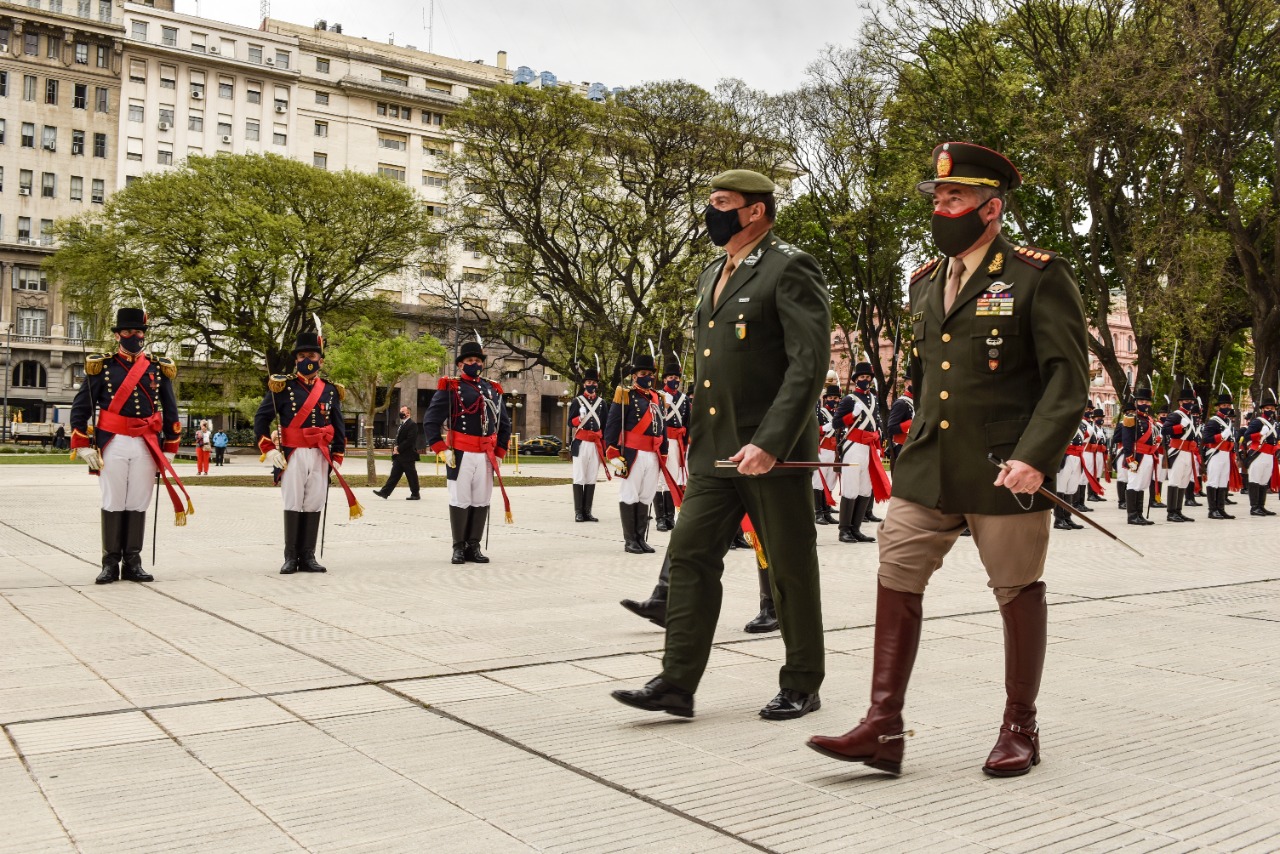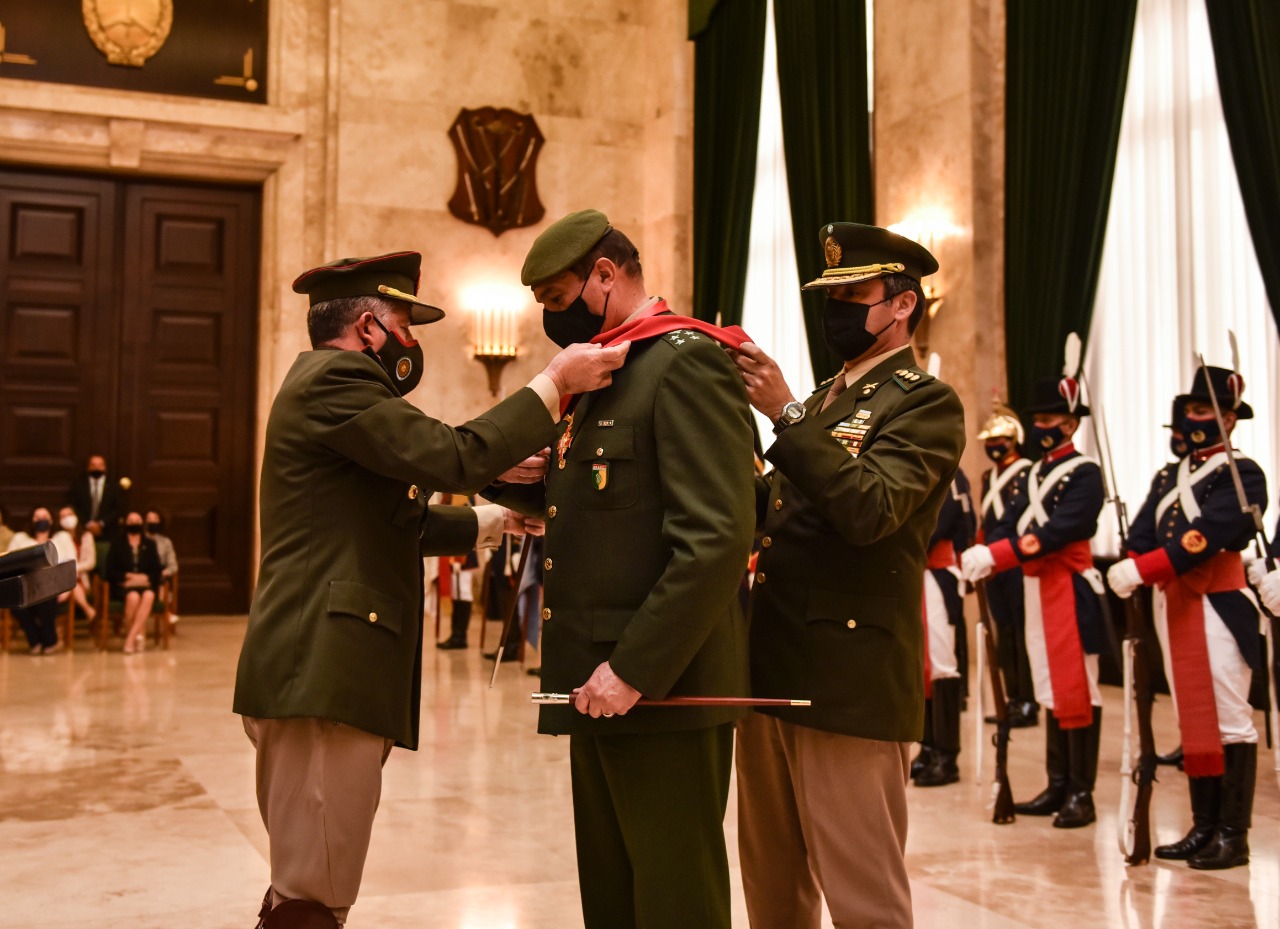Hoy, el jefe del Ejército Argentino entregó la Orden a los Servicios Distinguidos en el grado de Gran Cruz al comandante del Ejército Brasileño, general de ejército Paulo Sergio Nogueira de Oliveira, en su visita por el traspaso de la presidencia de la Conferencia de Ejército Americanos.