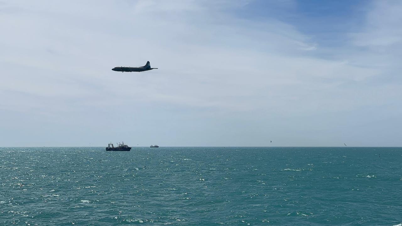 Por su parte, la aeronave Orion efectuó dos sobrevuelos de control entre el 10 y 13 de noviembre. Estos vuelos abarcaron una extensa área marítima de más de 641.000 millas náuticas cuadradas, sumando un total de 15 horas de vuelo, con la observación y seguimiento de las concentraciones de buques pesqueros extranjeros en las proximidades del límite exterior de la Zona.