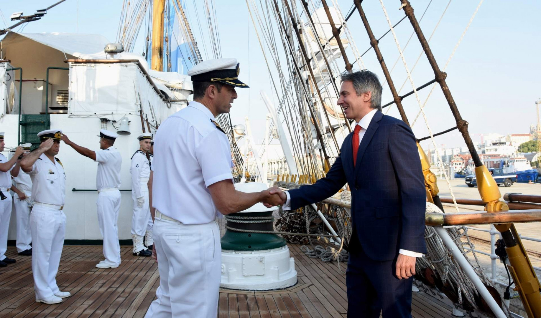 A pie de muelle fue recibida por el Embajador de la República Argentina en Portugal, Federico Barttfeld; quien estuvo acompañado por el Agregado de Defensa, Militar y Aeronáutico a la Embajada Argentina en Francia -con extensión en la República Portuguesa y el Reino de Bélgica- Coronel Hernán Aoki; la funcionaria diplomática Noel Borsellino y autoridades portuarias.