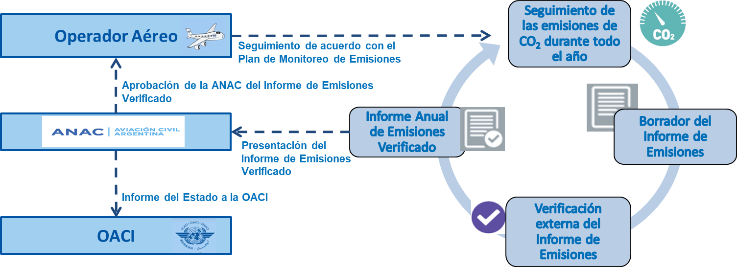 En este sentido, a partir del 1° de enero de 2019, todos los operadores aéreos con matrícula argentina que cubran rutas internacionales y que cumplan con los requisitos anteriores, deberán registrar y notificar anualmente a la ANAC, los datos de emisiones de CO2, conforme al Plan de Monitoreo de Emisiones (EMP) previamente aprobado.