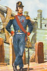 Los Jefes y Oficiales usarían casaca azul, bota, cuello y solapa celeste con galón de oro alrededor, chupa y pantalón azul o blanco, cabos –botones y galones- dorados. Las divisas, hasta Subtenientes, serían iguales a las del Ejército. Los pilotos usarían un ancla bordada a cada lado del cuello; los cirujanos, una hoja de laurel bordada en oro en el cuello y botas; los contadores, el mismo distintivo bordado en plata; los pilotines, una sardineta bordada en oro al cuello; los aspirantes, casaca sin solapa y dos sardinetas a cada lado del cuello.