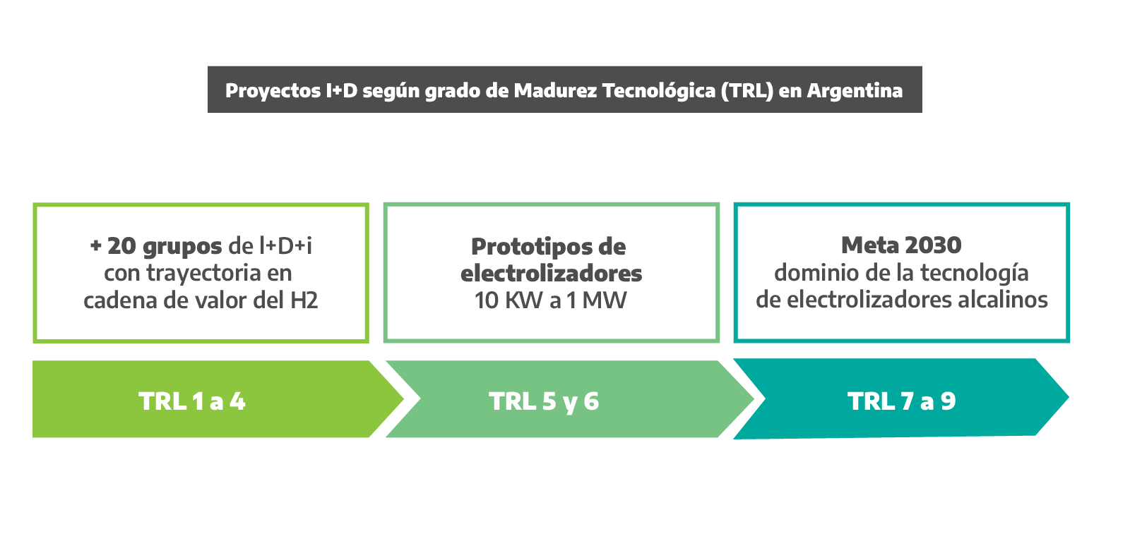 Argentina se propone, en el corto plazo, alcanzar el nivel de madurez tecnológica avanzada (TRL 7 a 9) para dominar la tecnología de electrolizadores alcalinos y sus equipos auxiliares}. La firma Y-TEC cuenta con un prototipo de electrolizador alcalino en etapa de prueba y apunta a construir el primer electrolizador alcalino de alta potencia (1 MW) de tecnología propia. Existen otros ejemplos como este, que se encuentran madurando con el objetivo de alcanzar en los próximos años una mayor cantidad de proyectos en etapas intermedias y avanzadas.