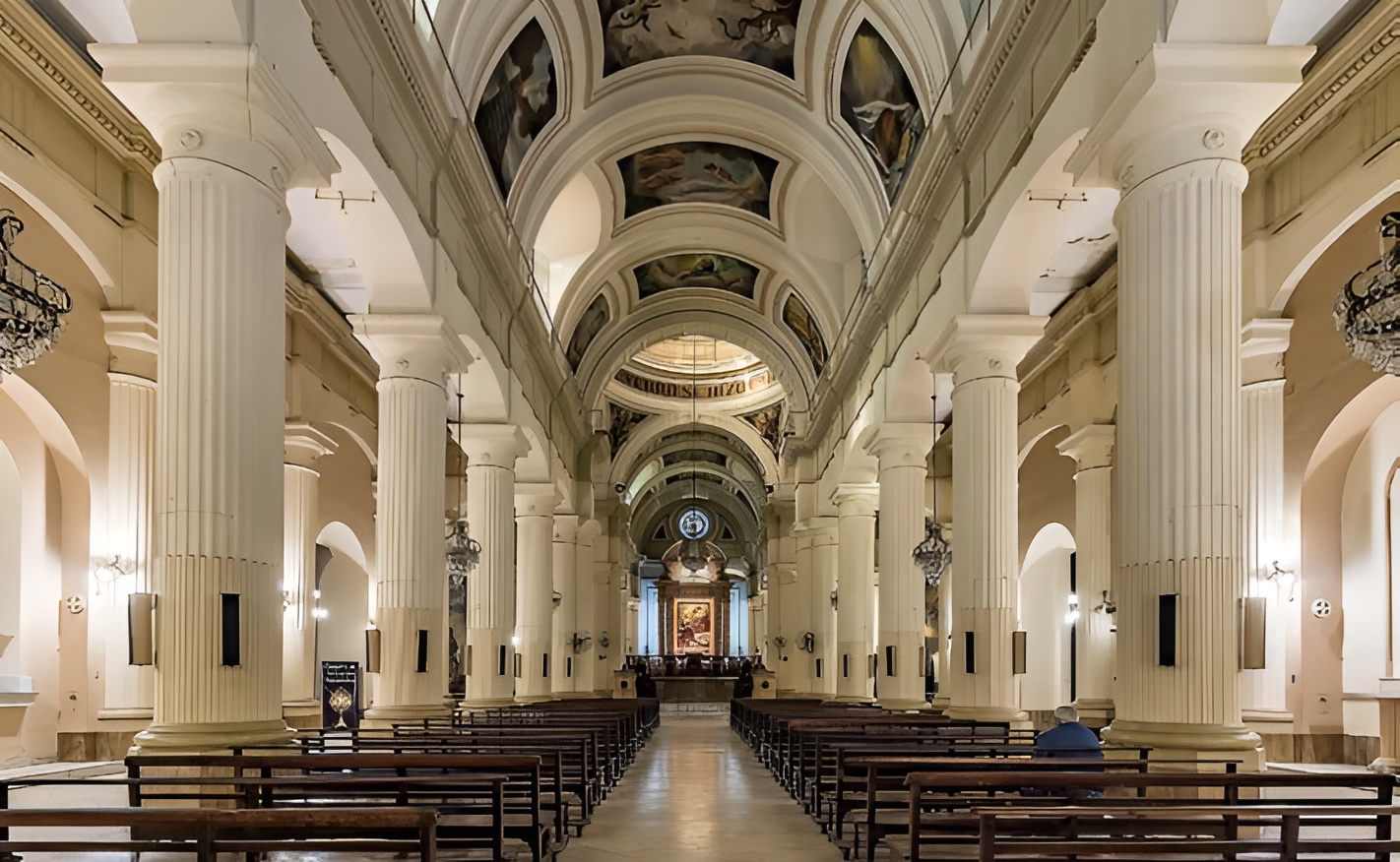 El pórtico de columnas dóricas apareadas, flanqueado por dos torres de cúpulas bulbosas, es el sector más antiguo de la catedral y el que conserva, con escasas variantes, el di- seño y construcción originales. Estilísticamente hay un claro eclecticismo en el conjunto que combina, en el mismo volumen, un nártex clásico con dos esbeltas torres decoradas con columnas jónicas en el primer cuerpo y corintias en el segundo, culminando en las citadas cúpulas bulbosas revestidas originalmente con mayólicas celestes y blancas, y hoy con cerámicos de terracota.