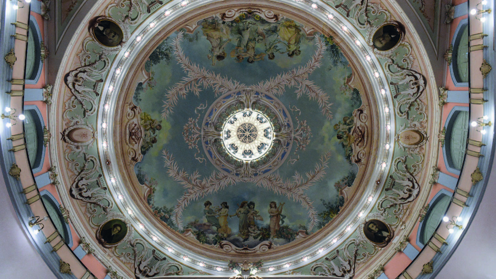 La sala principal, en forma de herradura, está decorada siguiendo los cánones del barroco, con riqueza de molduras y pinturas, entre las que se destacan las realizadas por el pintor Italo Piccioli en el intradós de la cúpula: una recreación del cielo, con ángeles, instrumentos musicales, guirnaldas y flores.