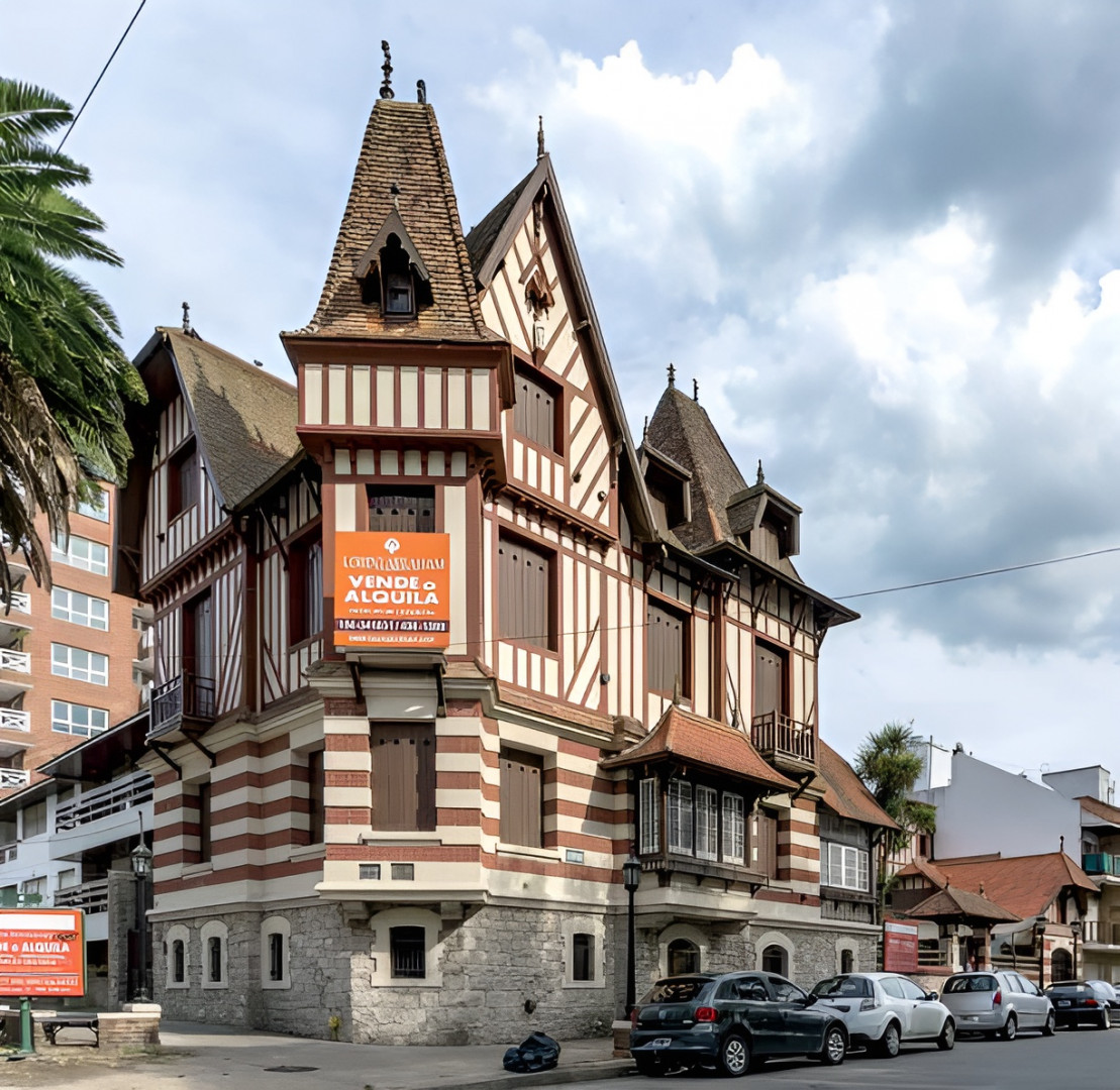 Un perfil quebrado de bay-windows y saledizos ensamblados que aumentan en altura refuerzan el protagonismo de las cubiertas destacadas por su variedad y policromía de aleros, torrecillas, chimeneas, buhardillas y pináculos de cerámica vitrificada. La madera es otro complemento fundamental del estilo, visible en carpinterías y postigos, balcones, jardineras y ménsulas torneadas. El piso noble se destaca mediante franjas alternas de revoque y símil ladrillo, y el alto, con falsos pans de bois verticales, diagonales y cuadriculados.