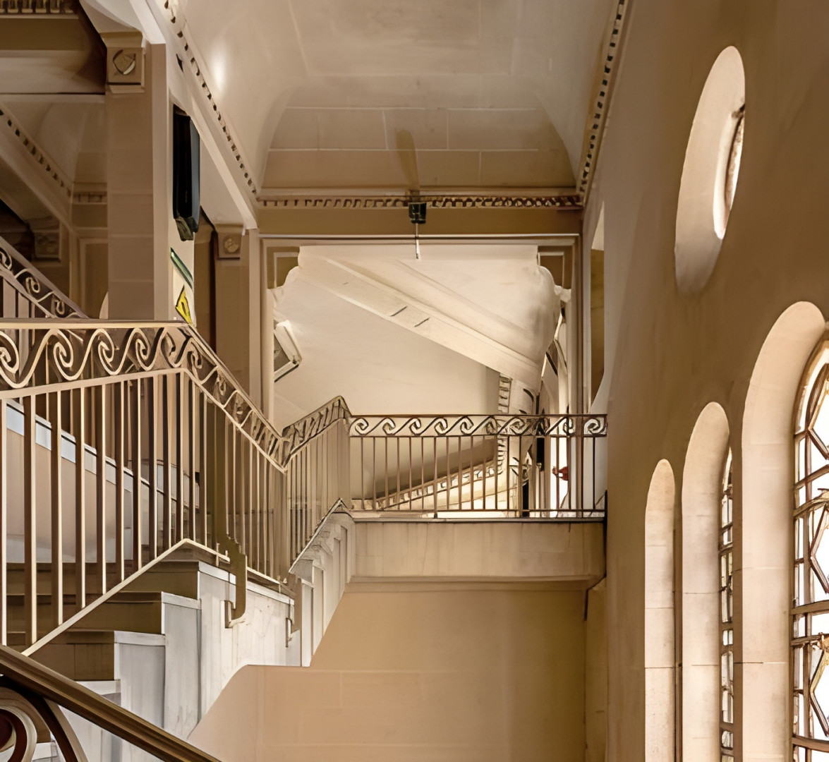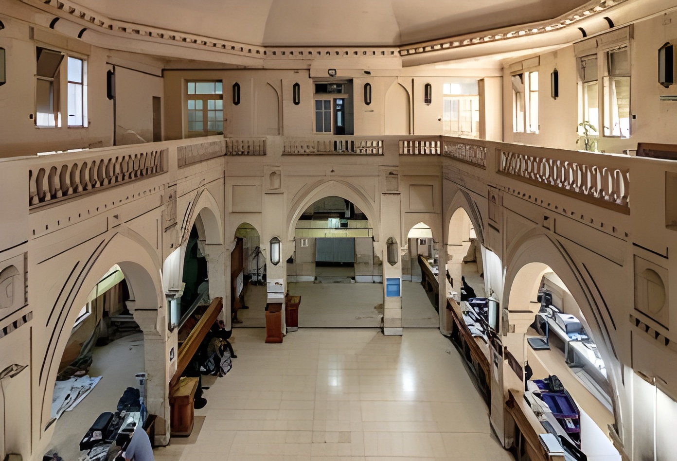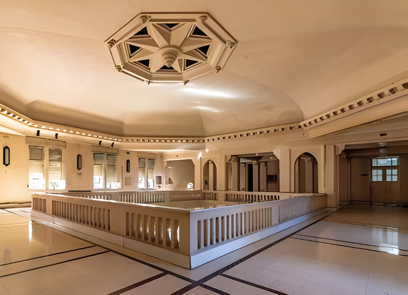 Se trata de un gran espacio central que parte del cuadrado y culmina en un octógono que define, a la vez, el tratamiento cóncavo del cielorraso; en el centro se ubica un elemento decorativo con forma de estrella. Una arcada ojival organiza el desplazamiento de los usuarios, y entre los arcos se insertan las oficinas de atención al público. En la planta alta funcionan las áreas administrativas de mayor jerarquía; allí, la circulación conforma un gran balcón desde donde se percibe el espacio central en toda su magnitud.