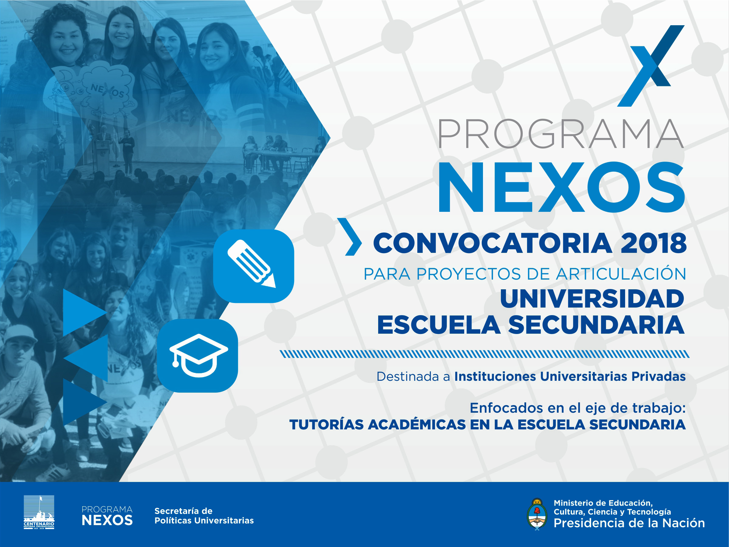 La SECRETARÍA DE POLÍTICAS UNIVERSITARIAS convoca a las Universidades e Instituciones Universitarias de Gestión Privada de todo el país a la presentación de proyectos en el marco de la Convocatoria 2018 “NEXOS: PROYECTOS DE ARTICULACIÓN UNIVERSIDAD – ESCUELA SECUNDARIA” destinados al fortalecimiento y mejora de la articulación entre las instituciones universitarias y las escuelas secundarias del país a través de la implementación de proyectos específicos.
