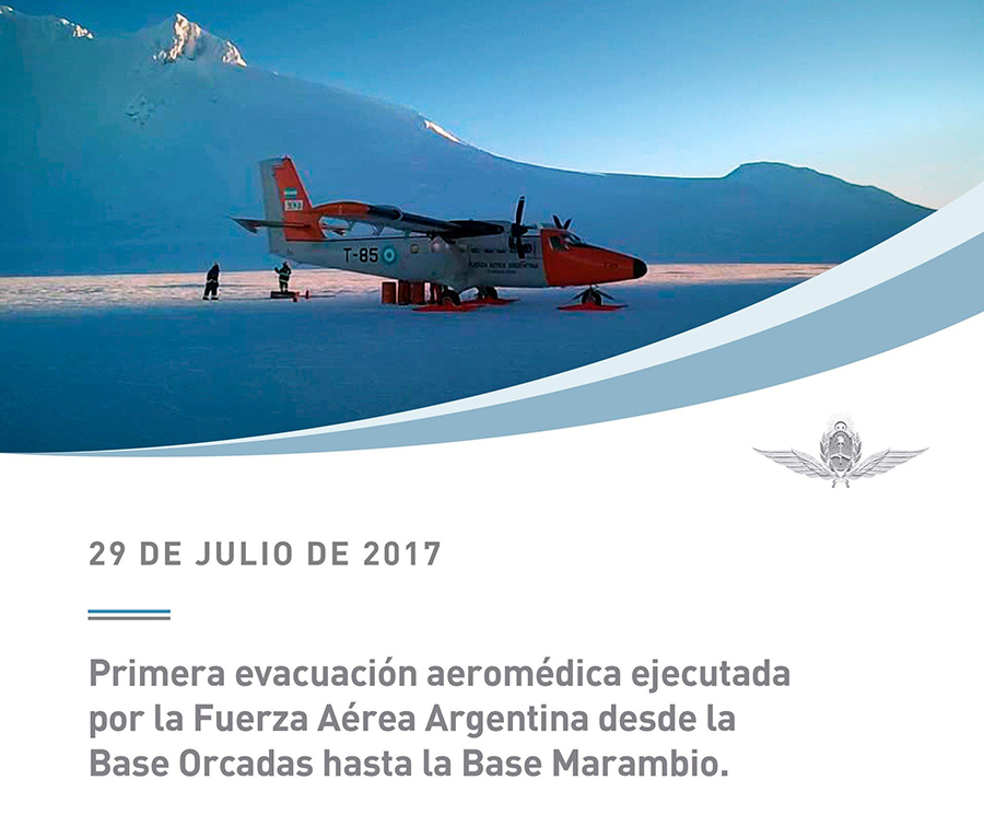 El 29 de julio de 2017, se concretó la primera evacuación aeromédica realizada por la Fuerza Aérea Argentina desde la Base Orcadas hasta la Base Marambio.