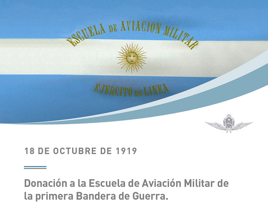 El 18 de octubre de 1919, la Comisión de Damas Cooperadoras Salesianas de la República Argentina, los Exploradores de Don Bosco, y los alumnos y exalumnos del Colegio del Sagrado Corazón de Jesús de La Plata donaron la primera Bandera de Guerra a la Escuela Militar de Aviación, que en ese entonces se encontraba en El Palomar. La recibió el teniente observador militar Argirio Teodoro Vadela Orito.