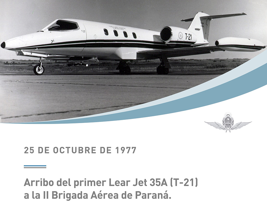 En 1977 arriba a la II Brigada Aérea (Paraná) el primer Lear Jet 35A (T-21). La Fuerza Aérea Argentina adquirió un total de 7 aeronaves para cumplir tareas de reconocimiento, relevamiento fotográfico, enlace, traslado de personal, vuelos sanitarios y ejecutivos, asistencia en casos de catástrofes naturales, y verificación aérea de radioayudas. Dichas aeronaves fueron destinadas al Grupo 1 Aerofotográfico (actual Grupo Reconocimiento Aeroespacial) de la II Brigada Aérea, y también al Instituto Nacional de Aviación Civil (INAC).