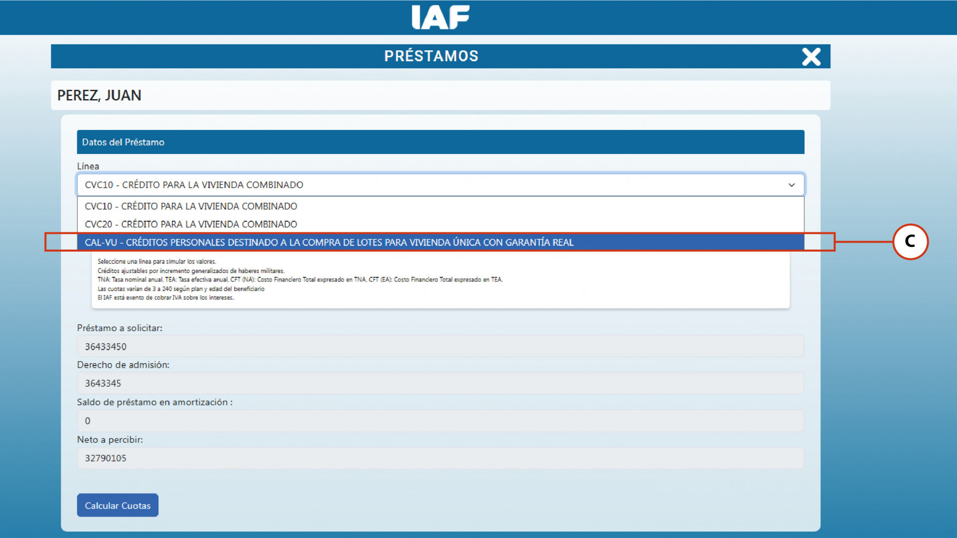6) Seleccioná la línea de crédito (C) a solicitar y hacé clic en Calcular cuotas para obtener el detalle del valor de cada cuota, tasa de interés, y el total a devolver.