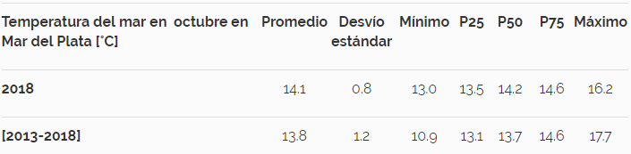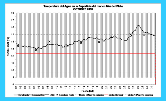 El gabinete de Oceanografía Física del Instituto Nacional de Investigación y Desarrollo Pesquero informó la temperatura del agua en la superficie del mar en Mar del Plata durante el mes de octubre de 2018.