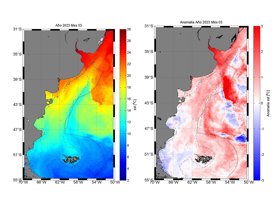 A partir de imágenes satelitales, el Programa de Sensoramiento Remoto del Instituto Nacional de Investigación y Desarrollo Pesquero (SERE) realiza un informe mensual sobre la temperatura superficial del mar y la concentración de clorofila del Mar Argentino.