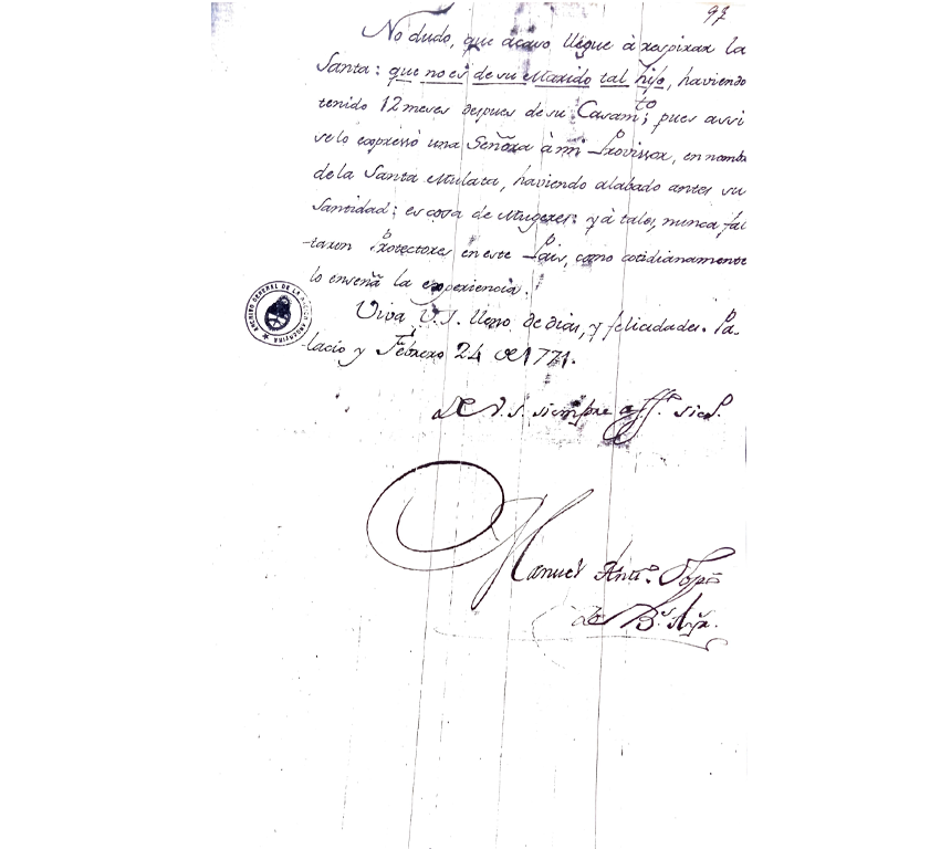El 24 de febrero de 1771 el obispo de Buenos Aires Dn. Manuel Antonio de la Torre enviaba al Gobernador y Capitán General de la entonces Gobernación homónima, Juan José de Vértiz y Salcedo, una misiva donde se pronunciaba acerca de una causa judicial.