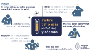 Contenido: documento con información clave sobre el ciclo de vida del mosquito transmisor del dengue, modos de prevención, síntomas y signos de alarma y pautas de cuidado.