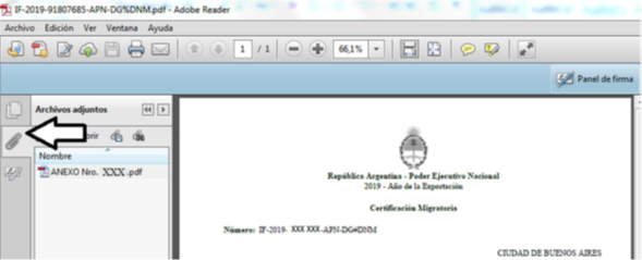 Una vez que ha descargado la certificación, debe abrir el archivo desde la carpeta DESCARGAS con el programa ADOBE READER PDF, donde observará en el margen izquierdo un ícono de un CLIP. Realizando doble clic sobre dicho ícono, podrá abrir e imprimir el ANEXO correspondiente a su certificado.