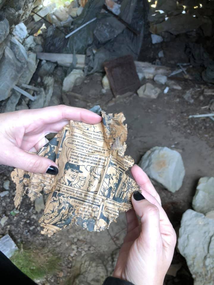 “El malvinense que nos acompañaba nos comentó que había un búnker nuevo, del lado oeste, descubierto hace apenas dos años y que todavía no estaba en el circuito que se suele recorrer. Decidimos ir a visitarlo. Es allí donde, entre municiones, restos de ropas y zapatillas, Gisela movió una piedra y encontró una revista. Sacamos 4, 5 fotos y la dejamos ahí, por respeto”, agrega Carlos.