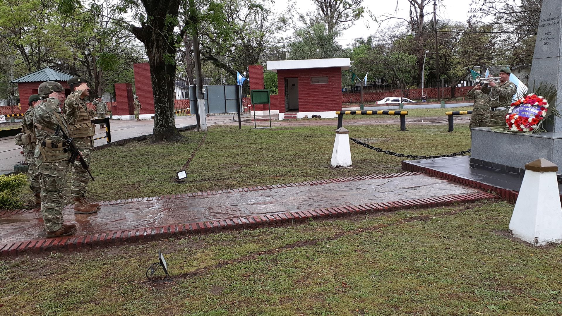 A las 1645 horas, hora en la que dio inicio la agresión al cuartel, el jefe de regimiento, coronel Gabriel De Senzi colocó una ofrenda floral en el cenotafio a los caídos.