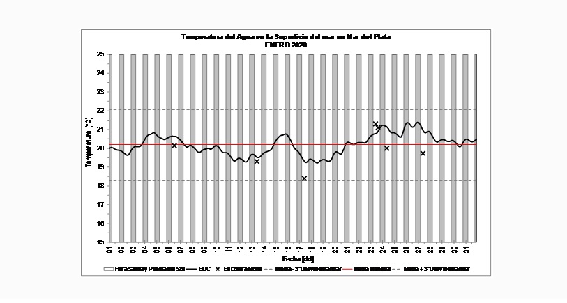 El Gabinete de Oceanografía Física del Instituto Nacional de Investigación y Desarrollo Pesquero (INIDEP) informó la temperatura del agua en la superficie del mar en Mar del Plata durante enero de 2020.
