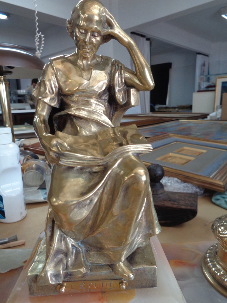 El tintero L´ Étude (el estudio) de 37.5 cm de alto por 48 cm de ancho y 29 cm de profundidad firmado (Sello) por la Societé des bronzes de París.