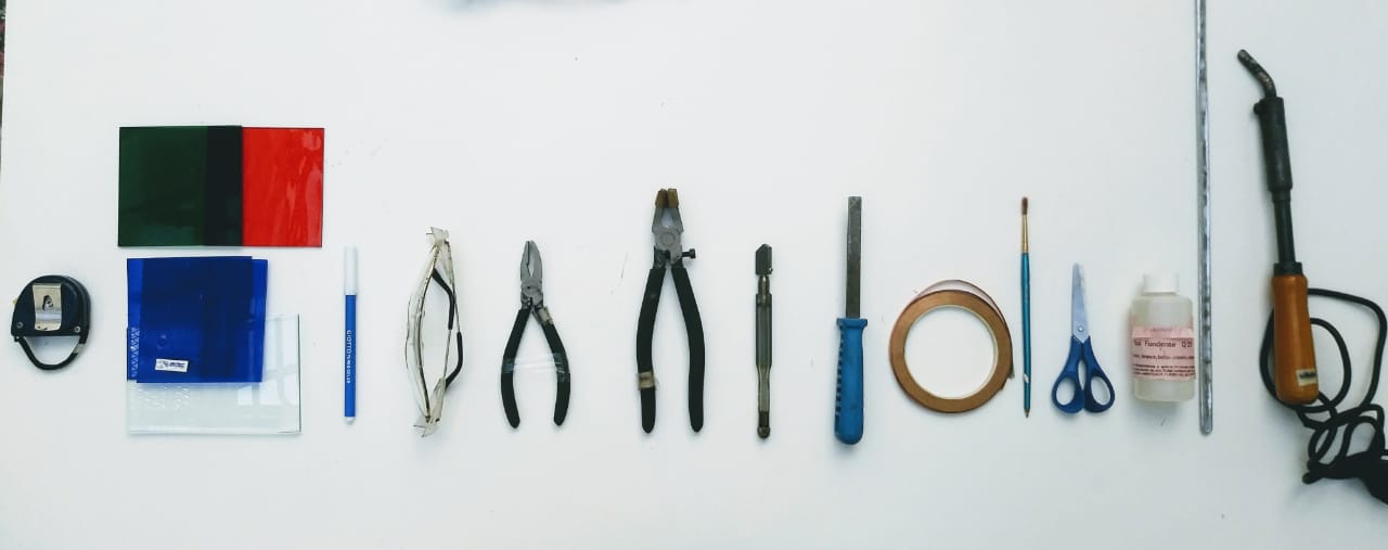 Los elementos necesarios para realizar el trabajo son cinta métrica, vidrios, marcador negro, anteojos de seguridad, pinza dentada, pinza "pico de pato", cortante de vidrio, lima metálica plana, cinta de cobre, pincel, tijera, fundente para soldar estaño y plomo, varilla de estaño y plomo, soldador eléctrico para estaño, guantes., máscara protectora con filtros, para gases y vapores nocivos.