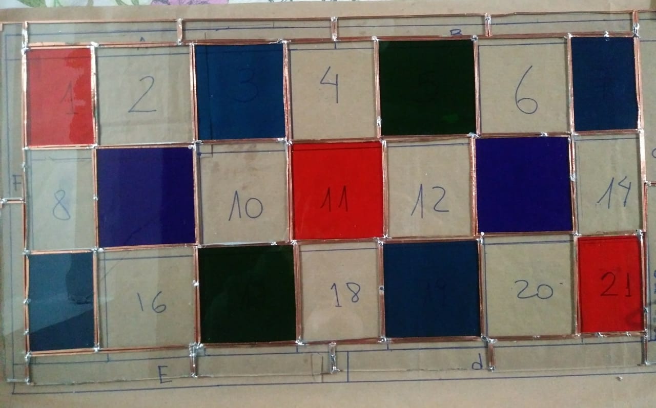 Reacomodamos todas las piezas ya encintadas sobre el diseño original, con sus números correspondientes, sujetadas con cinta de papel, para que las piezas no se deslicen, colocamos con pincel el fundente sobre la cinta de cobre y comenzamos a fijar las partes con pequeños puntos de estaño.