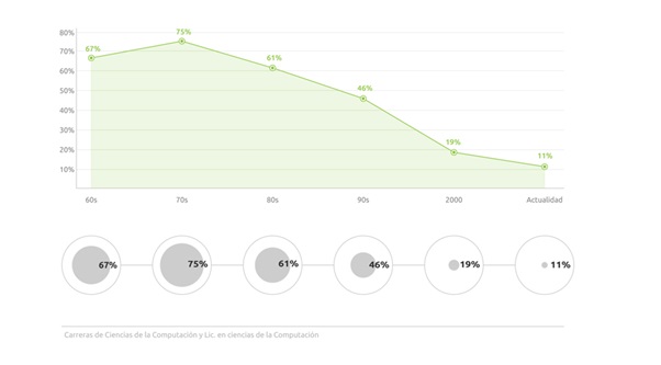 Se hace una pequeña encuesta entre los y las participantes. Tienen que adivinar qué porcentajes de graduades de Ciencias de la Computación son mujeres. Y ¿en 1970? Después de recibir algunas respuestas se les muestra el siguiente gráfico del estudio de la Fundación Sadosky “Y las mujeres ¿Dónde están?”