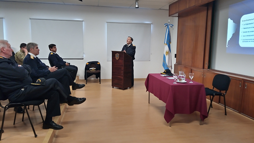 Seguidamente, tomó la palabra el Contraalmirante Sanguinetti y dio una exposición referida a los orígenes del CAMAS y explicó cómo se entendió la necesidad de control del tráfico marítimo. «Si el hombre tiene el privilegio de explotar el mar también tiene la obligación de protegerlo», dijo, y detalló la importancia de trabajar entre los cuatro países que integran el CAMAS: Argentina, Brasil, Uruguay y Paraguay.