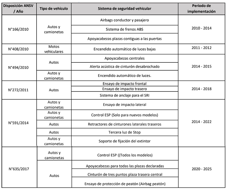 En nuestro país, a partir de la sanción de la Ley Nacional de Tránsito N°24.449(16), los vehículos deben cumplir con una serie de condiciones de seguridad activas y pasivas, de emisión de contaminantes y demás requerimientos para poder circular. En ella se hace referencia tanto a dispositivos de seguridad, como a procesos de ensayos técnicos que certifican el comportamiento del vehículo ante un impacto. Es por esto que a partir de 2008 y con el fin de incrementar la seguridad vehicular vigente en la Argentina, la ANSV convoca a las terminales e importadoras automotrices a conformar una mesa de trabajo con el objetivo de armonizar y ejecutar un cronograma de implementación de elementos de seguridad activa y pasiva, tanto para autos y camionetas como para motocicletas. Desde entonces y hasta la fecha, se lograron acuerdos en torno a una serie de elementos de seguridad vehicular correspondientes a distintos tipos de vehículos: automóviles, camionetas y motocicletas (Cuadro 2).