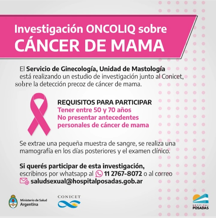 El Servicio de Ginecología, Unidad de Mastología del Hospital Posadas, está realizando un estudio de investigación junto al CONICET, sobre la detección precoz de cáncer de mama.