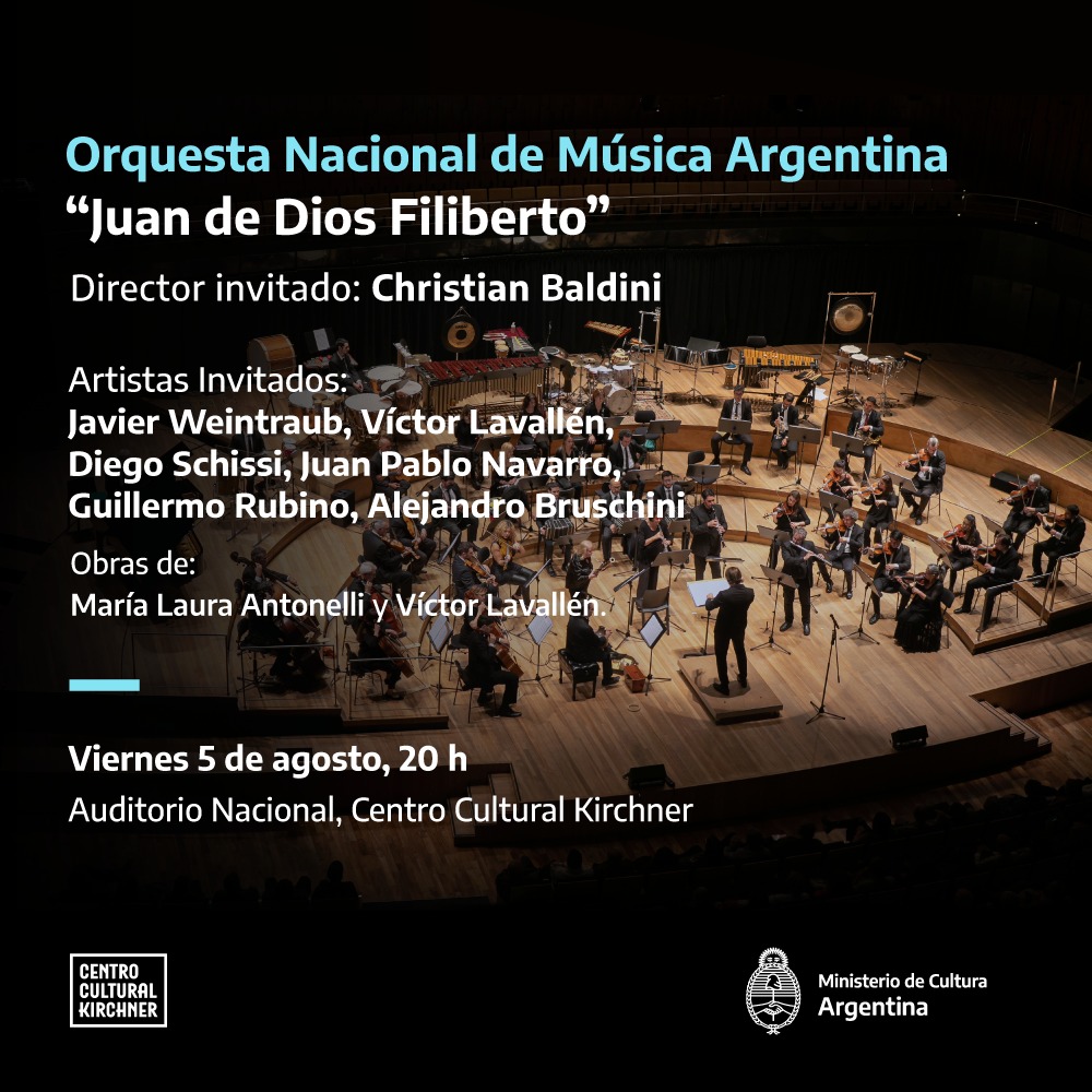 El próximo viernes 5 de agosto a las 20 h la Orquesta Nacional de Música Argentina “Juan De Dios Filiberto" ofrecerá un nuevo concierto gratuito en el Auditorio Nacional del Centro Cultural Kirchner (Sarmiento 151, ciudad de Buenos Aires).