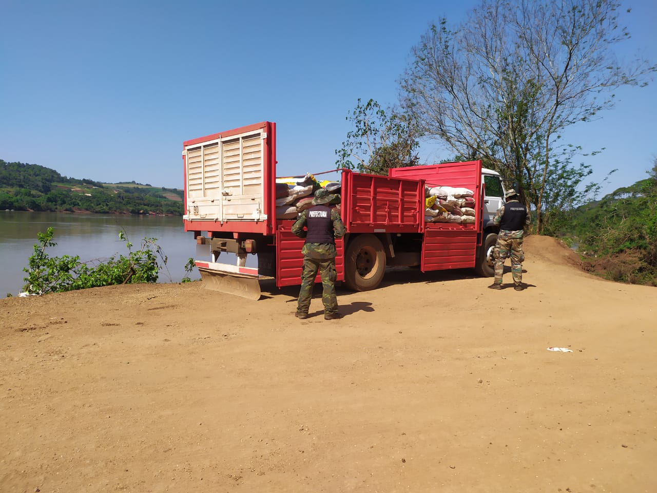 Al interceptarlos, el personal de Prefectura constató que se trataba de 111 bolsas de granos de soja con 50 kilos cada una, que estaban siendo cargadas desde un camión hacia una embarcación embicada en la costa.