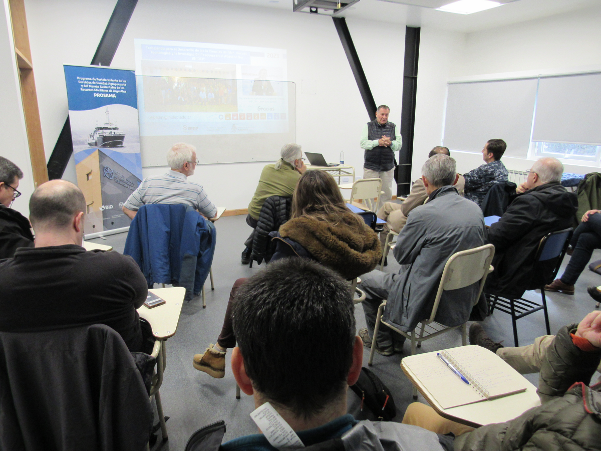 En primera instancia, el miércoles 14 de junio en un aula de la Universidad Nacional de Tierra del Fuego (UNTDF), el director del INIDEP presentó los alcances del Programa de Fortalecimiento de los Servicios de Sanidad Agropecuaria (PROSAMA), que cuenta con financiamiento del BID y será ejecutado por la DIPROSE.