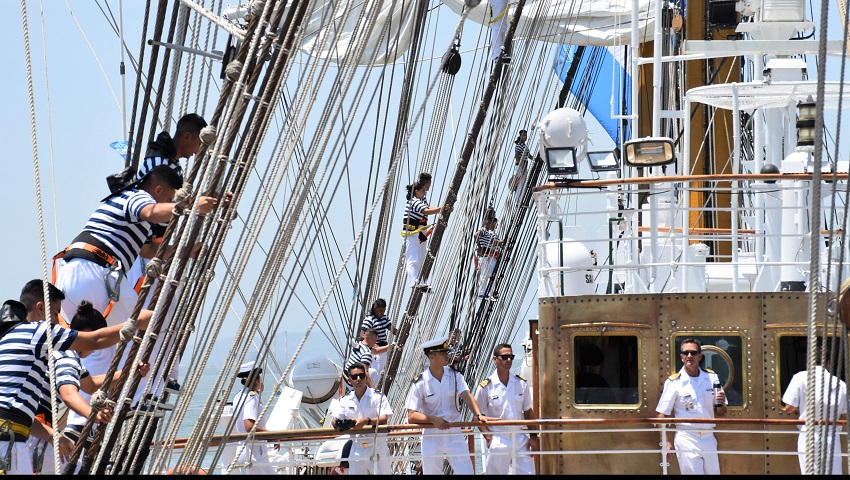 La tripulación de la fragata “Libertad” formó en la cubierta y los gavieros subieron a los palos. También se desplegaron velas con los colores de la bandera argentina y del país anfitrión, que se pudieron apreciar desde la ciudad.