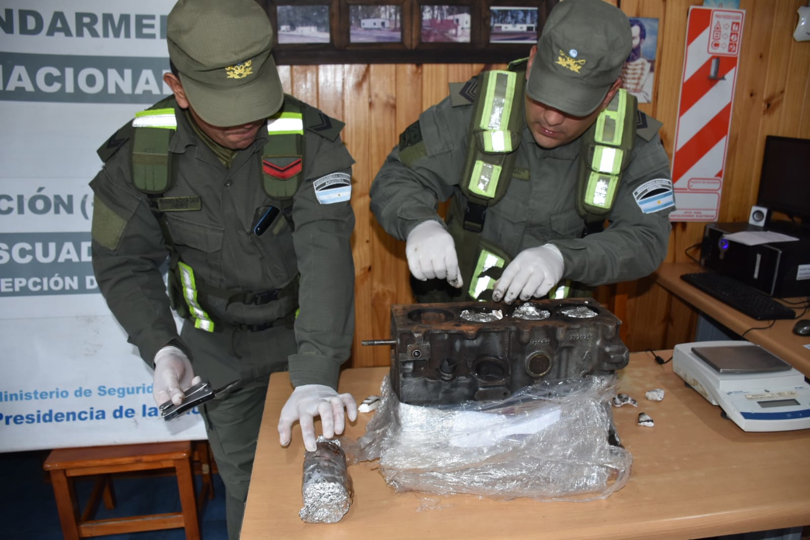 Con autorización del Juzgado Federal de Concepción del Uruguay, los funcionarios abrieron la encomienda, la cual contenía un bloque de motor vehicular con ocho paquetes dentro de los cilindros de los pistones.