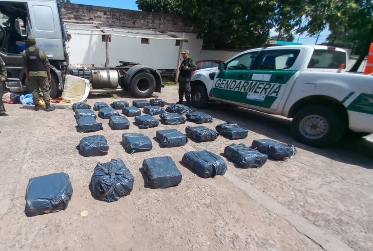 Ante esa situación, los uniformados realizaron una requisa de la cabina del camión, en la cual, el can detector de narcóticos de la Fuerza marcó la posible presencia de estupefacientes en 11 bultos embalados en bolsas de consorcio que estaban ubicados en el sector de la cama cucheta.
