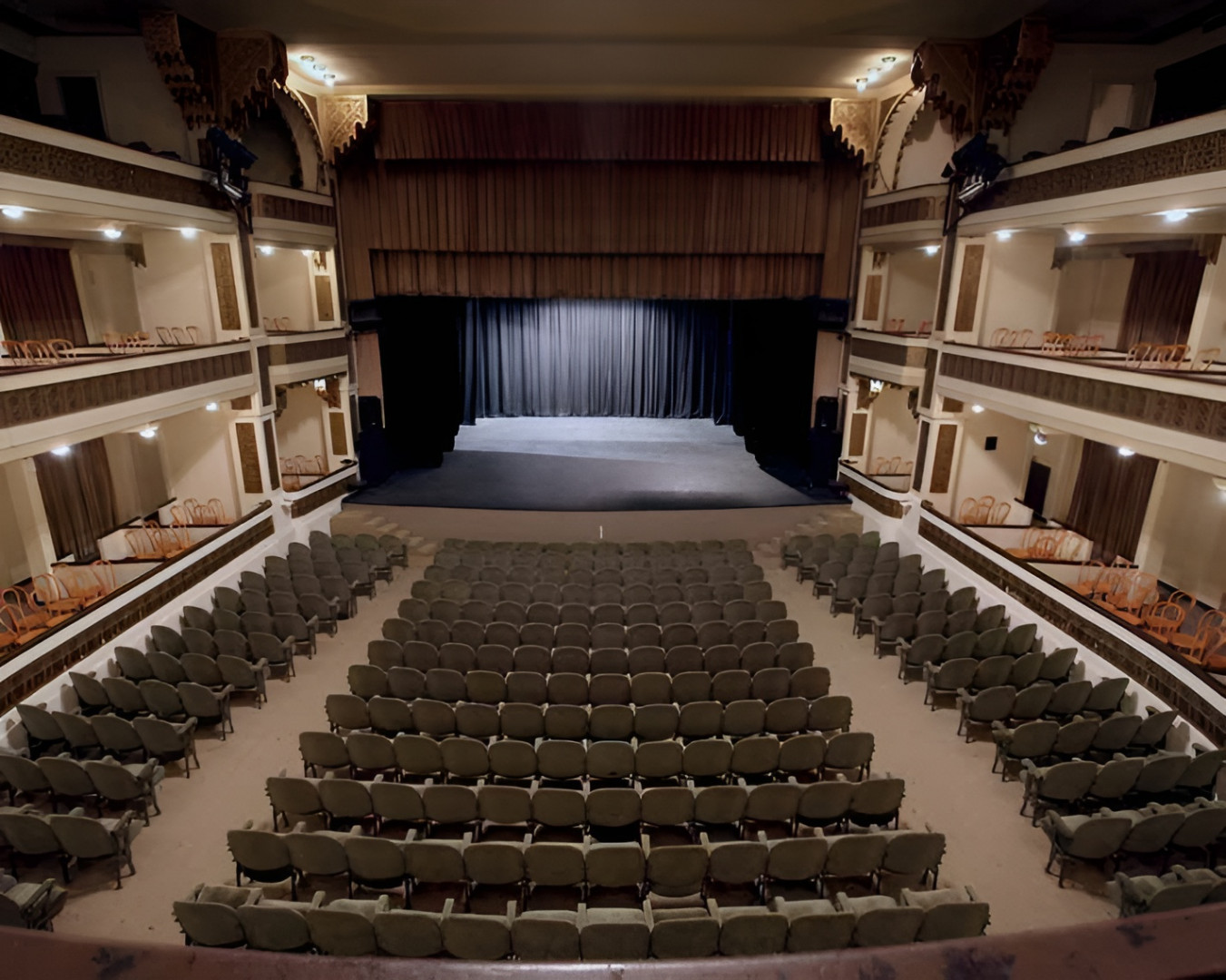 Estas últimas influencias estilísticas predominan en el gusto por el uso de vitrales y por las amplias ventanas-balcón de arquerías flamígeras inspiradas en el Gótico isabelino español, resueltas en piedra tallada con pináculos. El piso alto –correspondiente a los antiguos salones y oficinas de la sociedad, hoy propiedad del Club Español– se resuelve, en cambio, con ventanas geminadas neorrománicas. El volumen posterior corresponde a la sala teatral en forma de herradura a la italiana, organizada con una platea integrada a un palco bajo y dos pisos altos.