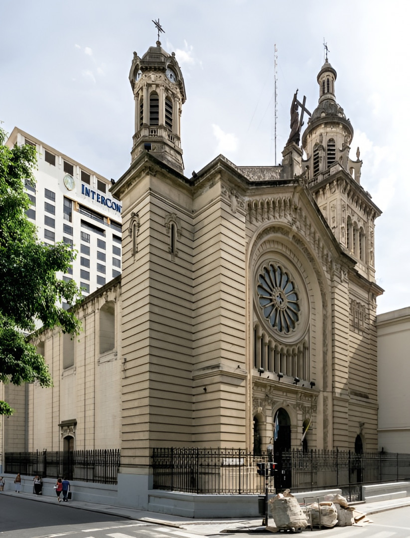 Al restaurarlo, treinta años más tarde, se separó la mesa para oficiar la misa de cara al pueblo. En la composición de la fachada, realizada en 1895 por J. M. Belgrano en líneas neorrománicas, y posteriormente rehecha por Rómulo Ayerza, se destaca el gran arco central con rosetón y vitrales coronado por un frontis con pequeños arcos pensiles. La flanquean torres asimétricas, distintas en tamaño, forma y altura.