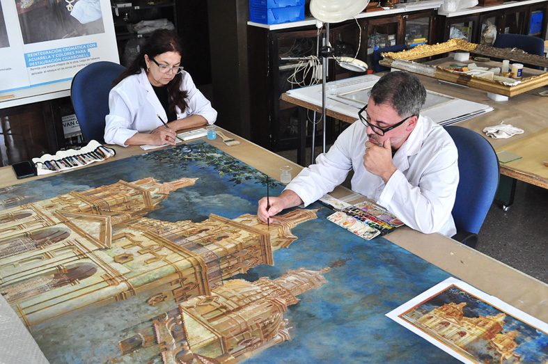 Se está finalizando la restauración cromática del cuadro con acuarelas dándole el equilibrio y la consolidación que poseía en su concepción. Una obra que realmente realza las imágenes de las catedrales.