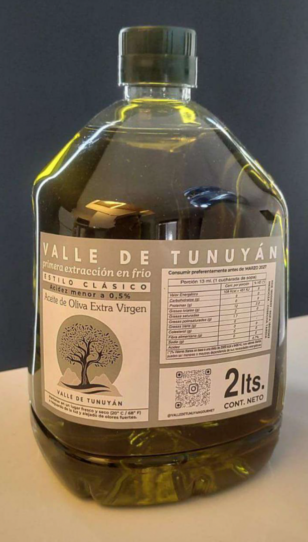 - Aceite de oliva extra virgen Clásico; marca Valle de Tunuyán; primera prensada en frío; RNE: 18000937; RNPA: 18010363; Mendoza