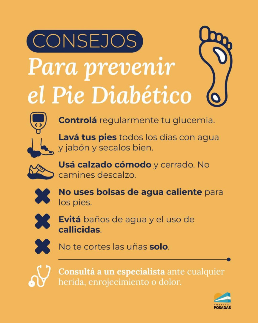 El pie diabético es una complicación frecuente de la diabetes que puede producir lesiones, infecciones o úlceras en los pies. Esto ocurre porque las alteraciones en los niveles de glucemia producen una disminución de la sensibilidad por lo que los pacientes pueden lastimarse sin darse cuenta. También genera deformidades en el pie y predispone a lesiones por calzado. Con diagnóstico y control a tiempo, puede prevenirse.