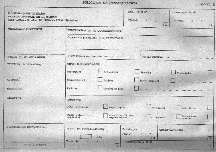 3.2.1. Llenado y remisión por duplicado al Archivo General de la Nación de los formularios de SOLICITUD DE DESAFECTACION (información global de la documentación a desafectar - anexo II) y el de INVENTAIO DE SOLICITUD DE DESAFECTACION (asiento detallado de las piezas documentales destinadas a eliminar - anexo II).